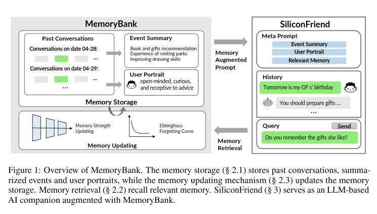 MemoryBank further incorporates a dynamic memory mechanism closely mirroring human cognitive process. This mechanism empowers the AI to remember, selectively forget, and strengthen memories based on time elapsed, offering more natural and engaging user experience.